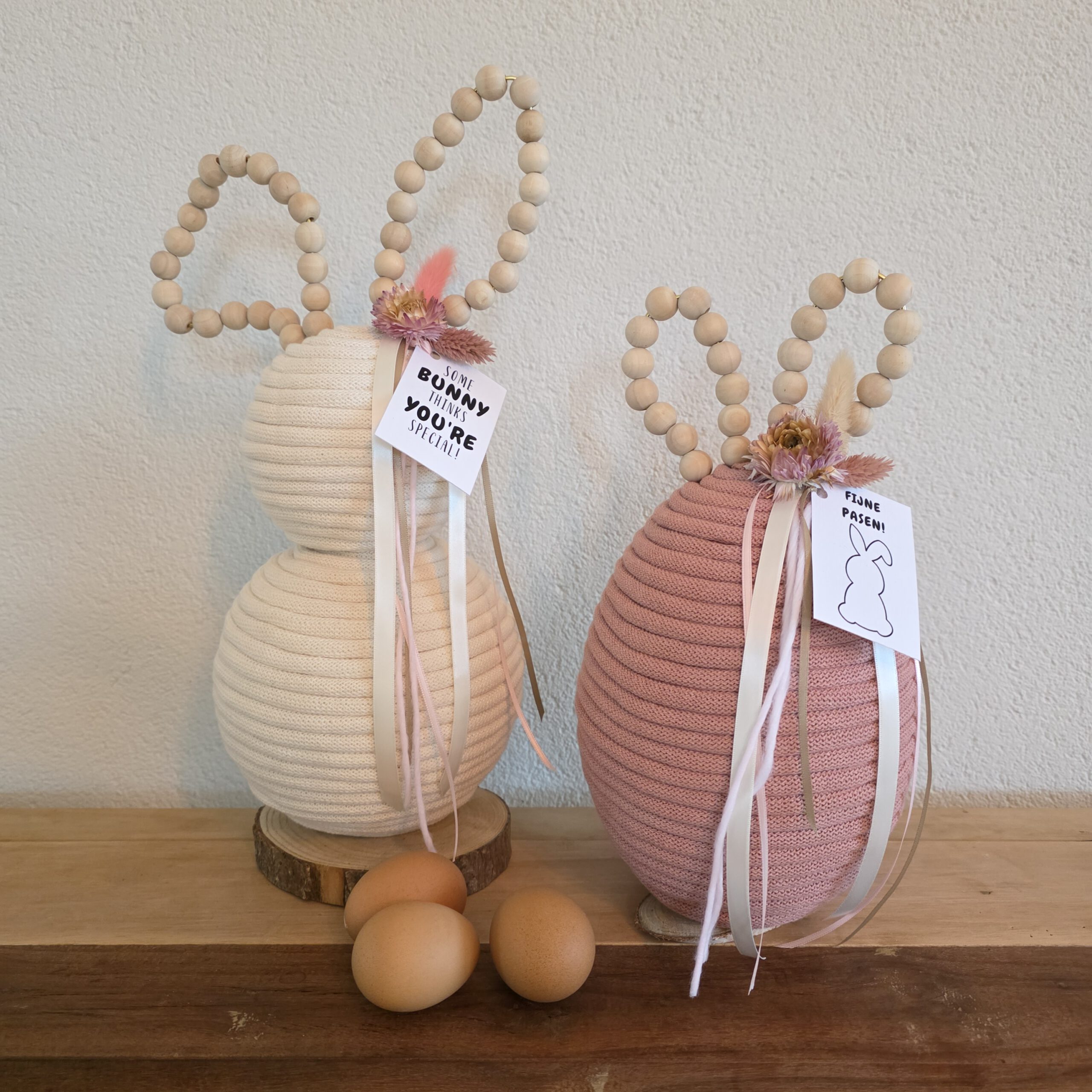 Je kan kiezen uit: Twee hazen Droogbloemen haas Macramé haasjes Paasdecoratie met kaarsen |